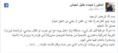 وكانت مواقع التواصل الاجتماعي في الإنترنت تداولت أنباء تزعم بأن ليث الحيالي، وهو شقيق الوزيرة، كان قياديا في تنظيم "داعش" إبان سيطرته على الموصل.