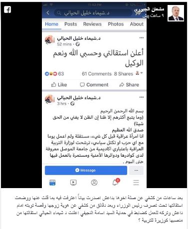 وقالت في بيانها: "أُعلن للجميع أنني أضع استقالتي بين يدي رئيس مجلس الوزراء عادل عبد المهدي للبت فيها فور تأكده من أية علاقة تربطني بالإرهاب أو الإرهابيين لا سمح الله".