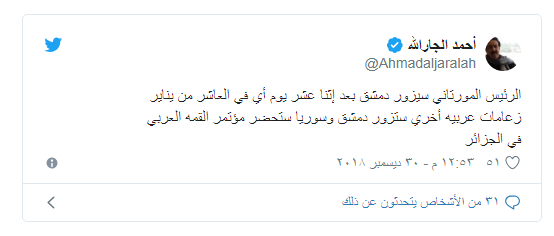 وكتب "الجار الله"، في تغريدة على صفحته الرسمية بموقع التواصل الجتماعي "تويتر": "الرئيس الموريتاني سيزور دمشق بعد إثنا عشر يوما أي في العاشر من يناير/كانون الثاني، زعامات عربيه أخري ستزور دمشق، وسوريا ستحضر مؤتمر القمة العربي".
