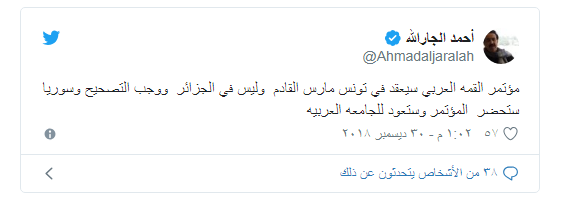 وأضاف قائلا: "مؤتمر القمة العربي سيعقد في تونس مارس/آذار القادم، وليس في الجزائر، وسوريا ستحضر المؤتمر وستعود للجامعة العربية".