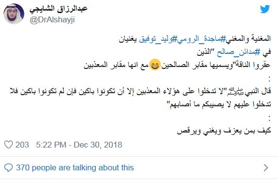 وما أثار غضب السعوديين، ظهور الفنانين في مدائن صالح، وقبور قومه الذين عقروا الناقة فعاقبهم الله، فبدلا من عملها مكانا سياحيا يجب أخذ العبر منها لأنهم قوم أغضبوا الله تعالى، وليسوا صالحين بقول الفنان وليد توفيق، بحسب النشطاء.