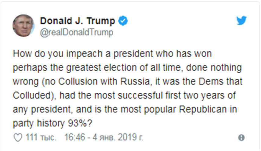 ورد ترامب في تغريدة كتب فيها: "كيف يمكن البدء بإقالة رئيس ربما ربح أعظم انتخابات في التاريخ، لم يرتكب أي خطأ -لا تعامُل مع روسيا، الديمقراطيون هم من تعاملوا معها- وسجل أفضل أداء في أول عامين مقارنة بكل الرؤساء، وهو أكثر الرؤساء شعبية في تاريخ الحزب الجمهوري مع نسبة 93%"؟
