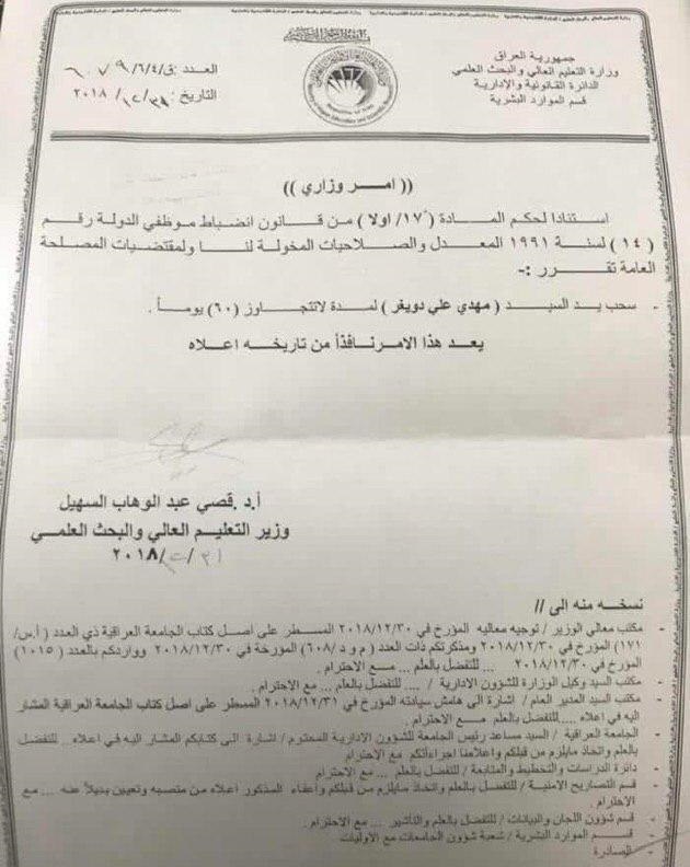 وذكرت وثيقة “استنادا لحكم المادة (17/اولا) من قانون انضباط موظفي الدولة رقم (14) لسنة 1991 المعدل والصلاحيات المخولة لنا ولمقتضيات المصلحة العامة تقرر سحب يد (مهدي علي دويغر) لمدة لا تتجاوز (60) يوما”.