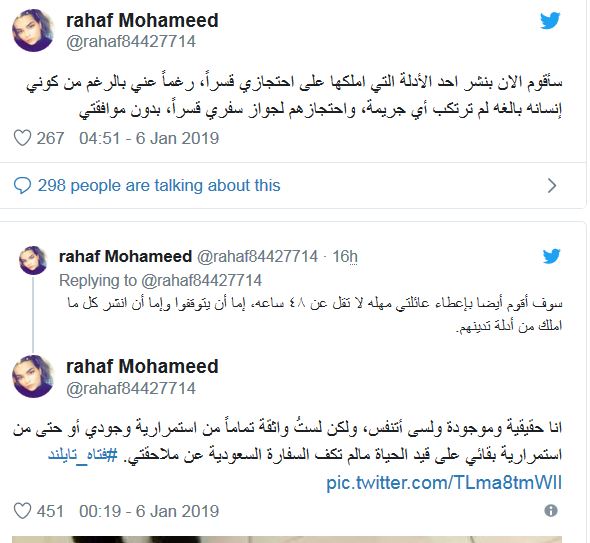 الفتاة التي تدعى "رهف محمد مطلق القنون"، قالت إن شخصا كويتيا يعمل في سفارة بلاده بتايلاند تعاون مع السفارة السعودية هناك، وتمكن من سحب جوازها، ليقول موظفو السفارة لها إنها ستعود إلى المملكة قسرا.