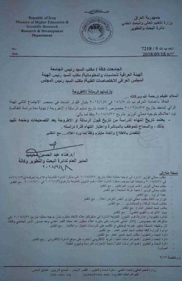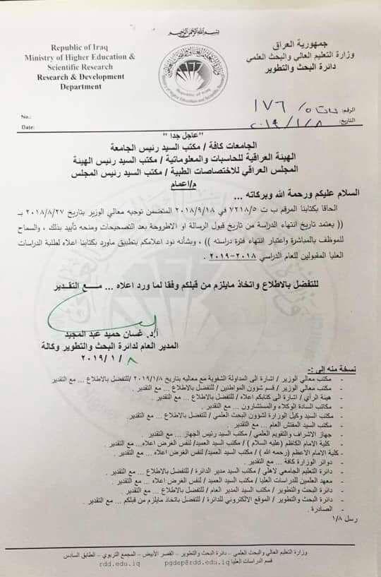 وجاء في الوثيقة، انه" الحاقا بكتابنا المرقم ي ت 5/7218 في 9/18/ 2018 المتضمن توجيه الوزير بتاريخ 27/2/2018 بـ{يعتمد تاريخ انتهاء الدراسة من تاريخ قبول الرسالة او الاطروحة بعد التصحيحات ومنحه تأييد ذلك، والسماح للموظف بالمباشرة واعتبار انتهاء فترة دراسته}، وبشأنه نود اعلامكم بتطبيق ماورد بكتابنا أعلاه لطلبة الدراسات العليا المقبولين للعام الدراسي 2018-2019"