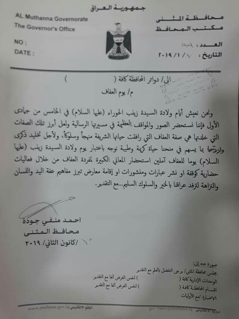وجاء في الكتاب الموجه الى دوائر المحافظة،" نعيش أيام ولادة السيدة زينب الحوراء {عليها السلام} في الخامس من جمادي الأول فإننا نستحضر الصور والمواقف العظيمة في مسيرتها الرسالية ولعل أبرز تلك الصفات التي خلدتها في صفة العفاف التي رافقتها حياتها الشريفة منهجاً وسلوكاً".