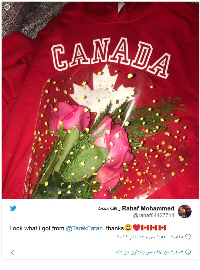 وشكرت رهف، في تغريدتها، الصحفي والكاتب الكندي ومؤسس الكونغرس الإسلامي الكندي، طارق عبد الفتاح، على السترة وباقة الزهور التي أرسلها لها فور وصولها إلى كندا قائلة: "هذا ما تلقيت من طارق عبد الفتاح، شكرا".