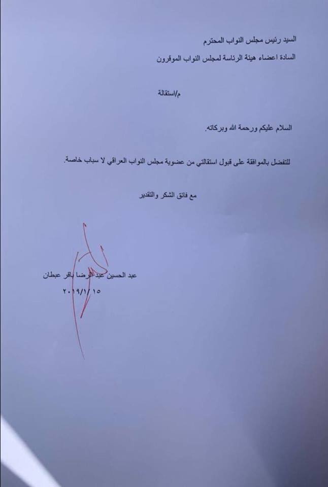 العراق-الكوثر: كشف مصدر سياسي أن النائب العراقي عبد الحسين عبطان قدم طلب إستقالته من عضوية مجلس النواب بالفعل لرئاسة البرلمان.