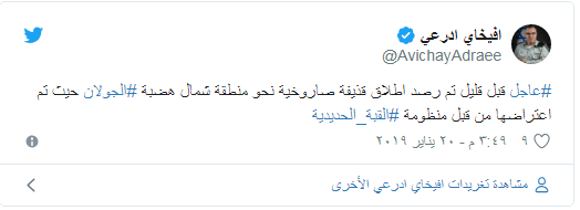 وقال الناطق باسم جيش الاحتلال، أفيخاي ادرعي، على صفحته الرسمية عبر "تويتر": "تم رصد إطلاق قذيفة صاروخية نحو منطقة شمال هضبة الجولان حيث تم اعتراضها من قبل منظومة القبة الحديدية"، مشيرا إلى أن جيش الاحتلال دفع بتعزيزات أمنية إلى مكان سقوط القذيفة، للقيام بأعمال بحث وتفتيش حسب قوله.
