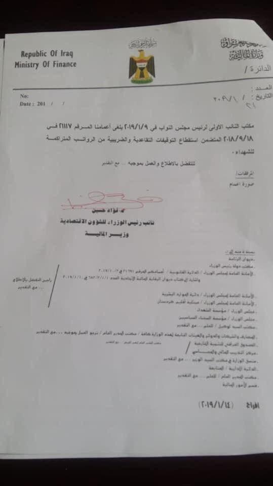 وعممت الوزارة لكافة الوزارات والهيئات الحكومية بإلغاء الاستقطاعات الضريبية وضريبة الدخل وإنطلاق صرف الرواتب المتراكمة لشريحة ذوي الشهداء في جميع الوزارات بعد ان توقفت لأكثر من عامين".انتهى