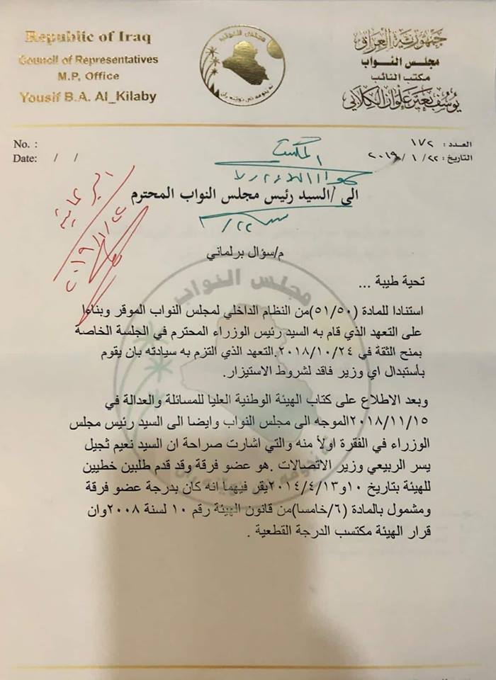 وبحسب وثيقة صادرة عن مكتب النائب عن ائتلاف "النصر" بتاريخ اليوم، 22 كانون الثاني 2019، فقد دعا الكلابي، إلى توجيه سؤال برلماني لرئيس الوزراء عادل عبد المهدي، وتحديد أقرب جلسة للإجابة عنه داخل البرلمان.