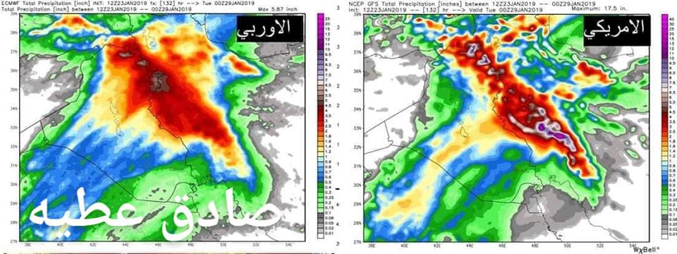 الخارطتين الاوليتين تمثل مقارنة لكميات الامطار الكلية المتوقع هطولها خلال فترة تأثير المخفض اي لغاية يوم 29 بالشهر وتبين اتفاق الاوربي والامريكي على أن مدن شرق وشمال البلاد هي الاعلى كمية تليها الوسطى ثم الجنوب ..