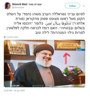 وحول ذلك قالت المحررة في موقع “المصدر الإسرائيلي” شيمريت مئير: على اللافتة الصغيرة فوق رأسه، يقتبس السيد نصر الله آية من القرآن الكريم (ادخلوها بسلام آمنين)، هل تشير إلى دخول سلس إلى فلسطين على الرغم من اكتشاف الأنفاق؟.