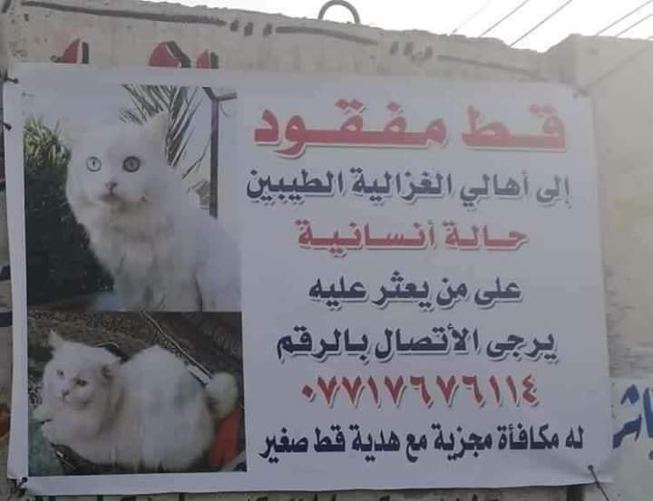 وذكر في لافتة علقت امام احد المنازل؛ بعنوان (قطة مفقودة) "الى أهالي الغزالية الطيبين؛ حالة إنسانية على من يعثر عليه (القط) الاتصال بالرقم المذكور وله مكافأة مجزية مع هدية قط صغير".