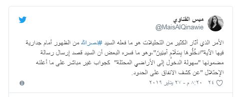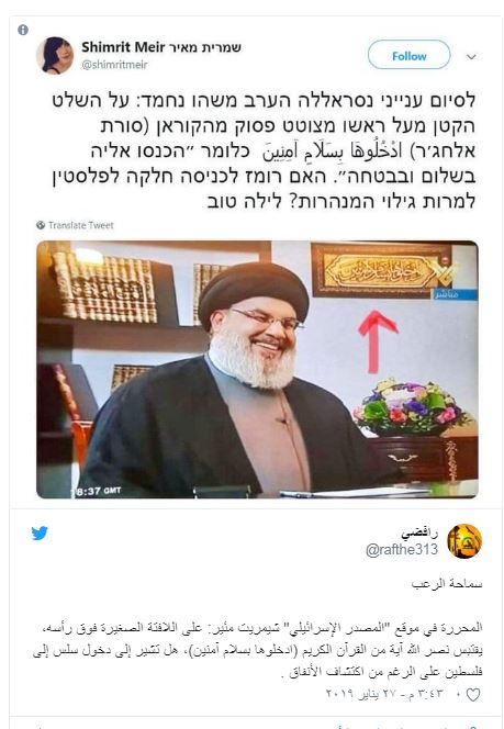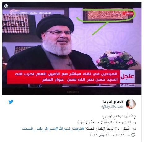 واعتبر بعض مستخدمي "تويتر" أن وجود هذه اللوحة خلف نصر الله في حواره مع قناة "الميادين" بعد نحو شهرين من الصمت "ليس صدفة وليس جزءا من الديكور وليس لإكمال الخلفية".