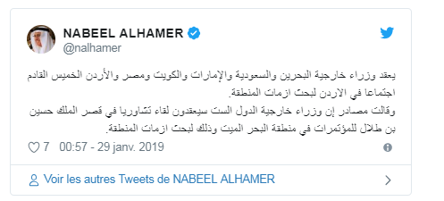 وقال المستشار نبيل الحمر أمس الاثنين في تغريدة له على موقع "تويتر": "يعقد وزراء خارجية البحرين والسعودية والإمارات والكويت ومصر والأردن الخميس القادم اجتماعا في الأردن لبحث أزمات المنطقة".