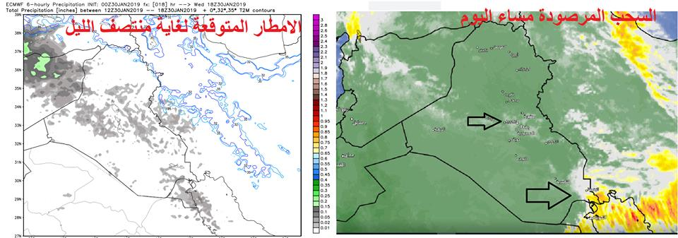 وقال المتنبئ الجوي الاقدم في مطار البصرة الدولي صادق عطية في حسابه على الـ"فيسبوك" اليوم 30 كانون الثاني 2019 إنه "رغم تواجد مرتفع جوي لكن فرص الامطار الخفيفة ستكون حاضرة على مناطق من مدن الشمال هذه الليلة ويوم غد الخميس أيضا" .