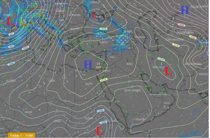وأشار إلى انه اعتبارا من يوم الاربعاء المقبل، سيتزحزح المرتفع الجوي جنوبا ايذانا باندفاع اخدود بارد في طبقات الجو العليا يرافقه منخفض سطحي متواجد حاليا على غرب فرنسا، سيجبره المرتفع الضخم المتمركز شرق اوربا على التزحزح جنوبا ليتقدم ببطأ نحو منطقتنا ويلاقي مد رطوبي ممتاز من منخفض السودان المداري في شمال البحر الاحمر مما يسبب حالة من عدم الاستقرار الجوي.