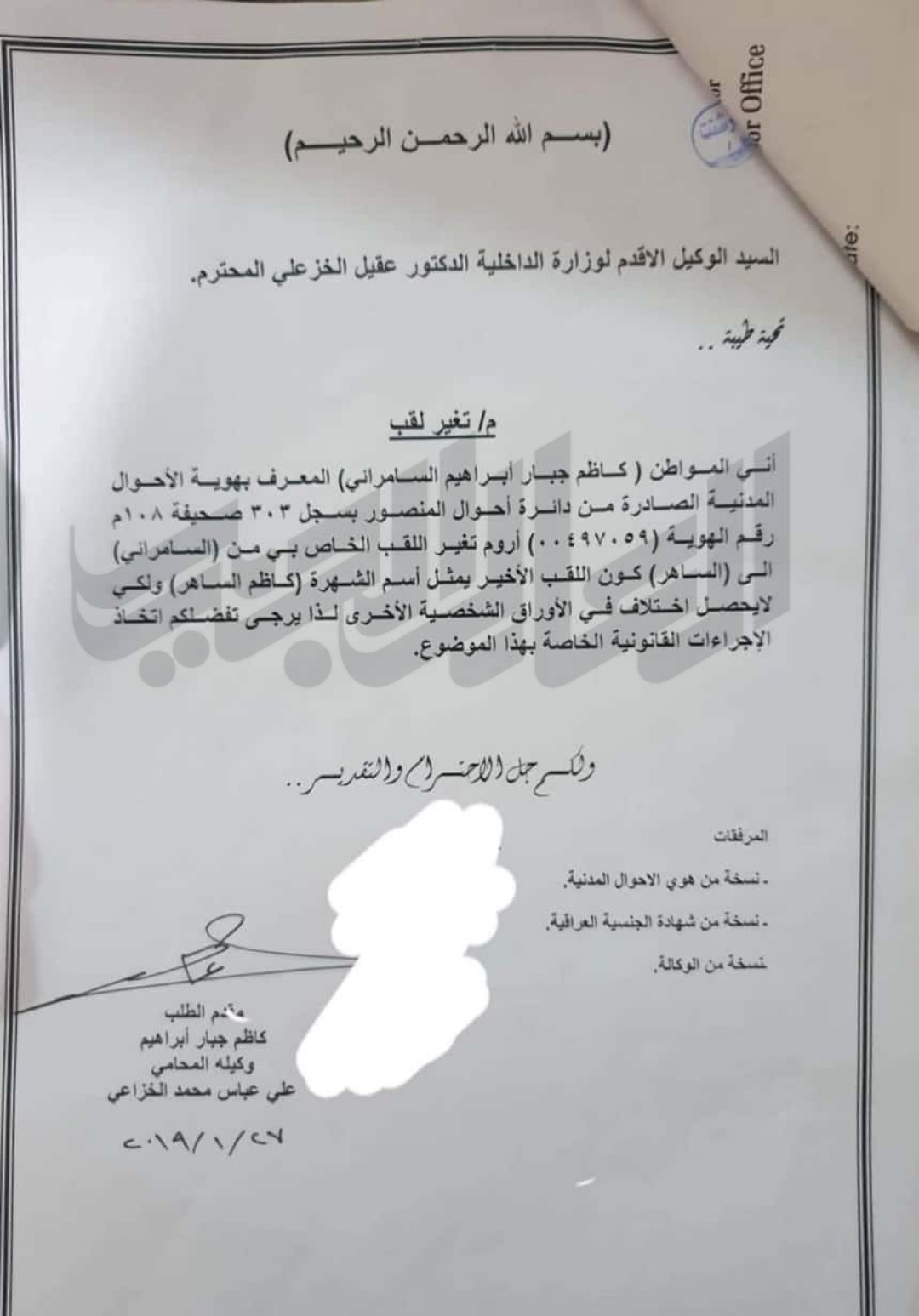 وبحسب الوثائق المرفقة بالمستمسكات الشخصية الرسمية للساهر، فقد قدم محامي الأخير طلبا إلى وكيل وزارة الداخلية عقيل الخزعلي، جاء فيه "إني المواطن كاظم جبار إبراهيم السامرائي المعرف بهوية الأحوال المدنية الصادرة عن دائرة أحوال المنصور بسجل 303 صحيفة 108م رقم الهوية (00497059)، أروم تغيير لقبي من السامرائي الى الساهر، كون اللقب الاخير يمثل اسم الشهرة (كاظم الساهر)"، وفق ما نقلته صحيفة "العالم الجديد".