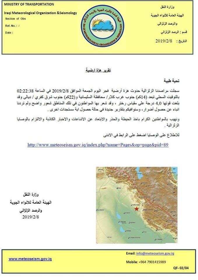 وذكرت وزارة النقل في بيان لها اليوم، (9 شباط 2019)، أن "مراصد الهيئة العامة للانواء الجوية والرصد الزلزالي سجلت حدوث هزة أرضية اليوم في جنوب غرب كلار/ محافظة السليمانية وجنوب شرق كفري / ديالى في الساعة 2،22 دقيقة بالتوقيت المحلي للمدينة" .