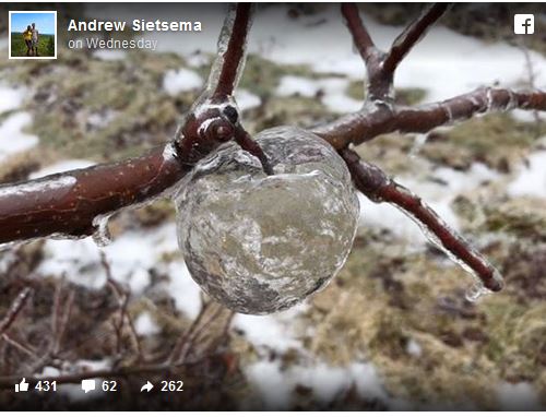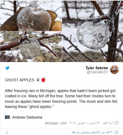 تداول مستخدمو شبكة التواصل الاجتماعي صورا لظاهرة غريبة حصلت في ميشيغان الأمريكية للتفاح الجليدي الشفاف، والفارغ من الداخل.