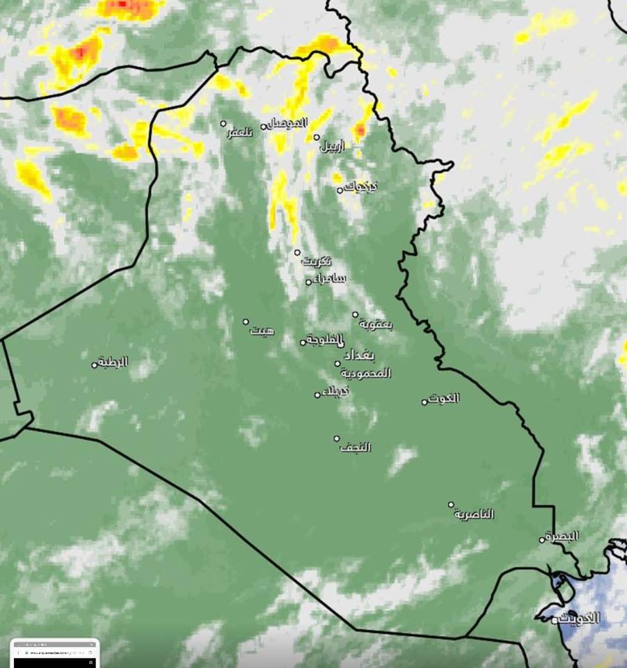 السحب المرصودة عن طريق الاقمار الصناعية صباح اليوم الاثنين توضح اجواء غائمة بشكل جزئي في مناطق عديدة من البلاد خصوصا الشمالية منها. توقعات الامطار نهارا ستكون في الانبار والموصل وكركوك واربيل وسليمانية ودهوك وصلاح الدين .....في مناطق متفرقه وليست شامله. اما خلال المساء والليل فتتوقف الأمطار في المناطق الغربية والشمالية ..وتشمل فرص الامطار الخفيفة ليلا مناطق متفرقة من المدن التالية فقط بغداد وبابل وكربلاء والسماوه والديوانية وذي قار والبصرة وغرب ميسان وشرق النجف ومناطق متفرقة من صلاح الدين.