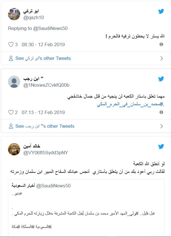 وأثارت صور ابن سلمان في الحرم المكي غضبا واسعا من مغردين، اعتبروا أن "ولي العهد السعودي لا يمكن لجرائمه أن تغتفر بمجرد زيارة الكعبة"، وفق تعبيرهم.
