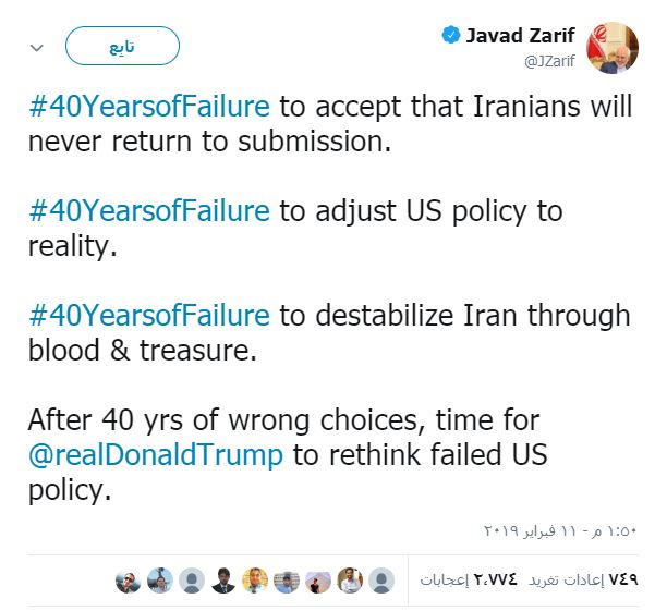 وأضاف ظريف في تغريدة عبر حسابه على موقع تويتر مخاطباً الإدارة الأميركية انه وبعد أربعين سنة من الفشل عليهم قبول أن الإيرانيين لا يركعون بتاتاً أمام اميركا.