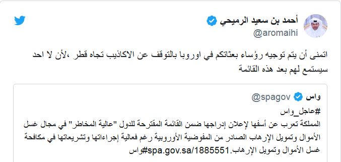 وتساءل في تغريدة أخرى: "بعد إدراج المفوضية الأوروبية السعودية بالقائمة الأوروبية السوداء لغسيل الأموال وتمويل الإرهاب، هل مازال الجبير على نفس قناعاته وفبركاته التي طالما رددها تجاه قطر ؟!".