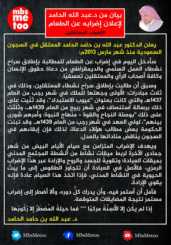 وهدد بالدخول في إضراب مفتوح وغير متقطع إذا استمرت السلطات السعودية في معاقبة أصحاب الرأي وسجنهم دون وجه حق.