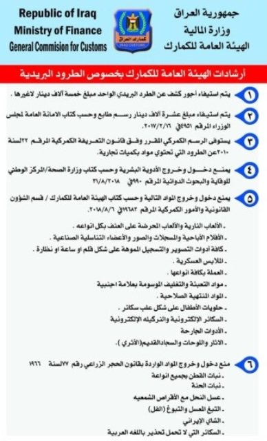 وقالت الهيئة في بيان لها انها "نشرت ارشادات بشأن الطرود البريدية والتي بينت فيها بانه يتم استيفاء اجور كشف عن الطرد البريدي الواحد مبلغ خمسة الاف دينار، ويتم استيفاء 10 الاف دينار رسم طابع".