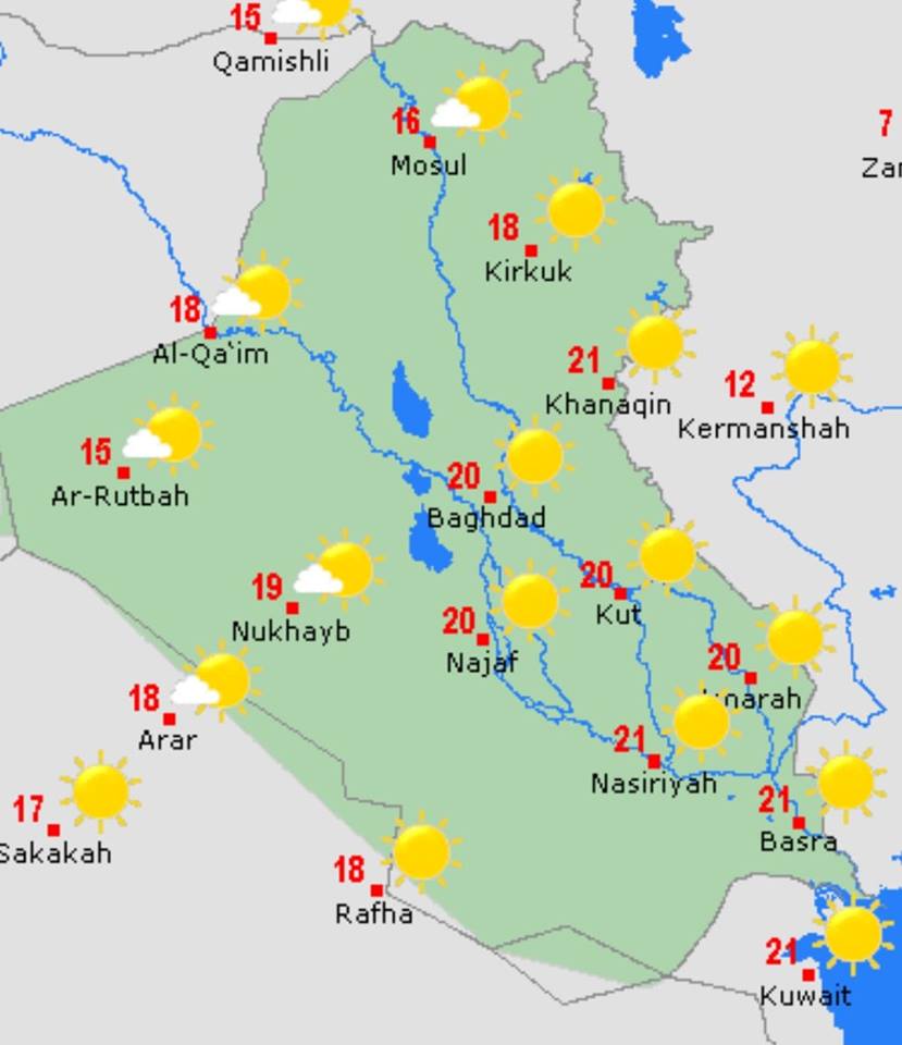 وذكر المتنبىء الجوي الأقدم في مطار البصرة، صادق عطيه، في منشور على "فيسبوك" اليوم، 20 شباط 2019، ان أجواء اليوم وغدا ستكون مستقرة والرياح ايضا مستقرة على الاتجاه الشمالي الغربي، ويكون الطقس يوم غد صحوا في الفرات الاوسط والجنوب وغائما جزئيا في الوسط والشمال وفرص هطول زخات خفيفه من الامطار واردة في مناطق متفرقة من مدن الشمال اضافة الى صلاح الدين وديالى وشمال الانبار .