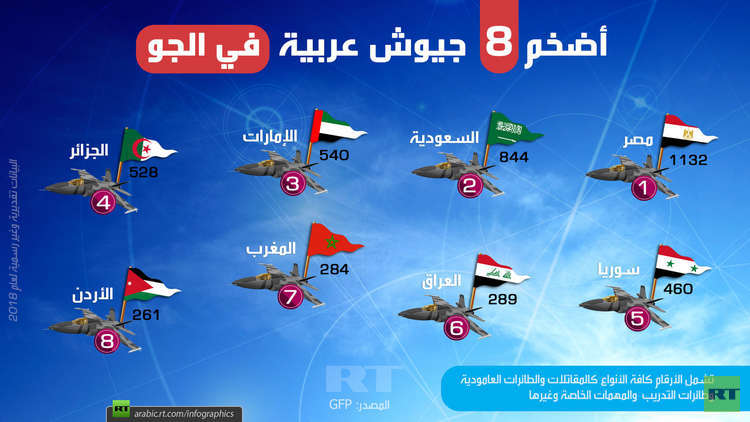 ثم العراق خامسا 289 طائرة, والمغرب سابعاً 284 طائرة, وأخيرا في المركز الثامن جاء الأردن 261 طائرة.