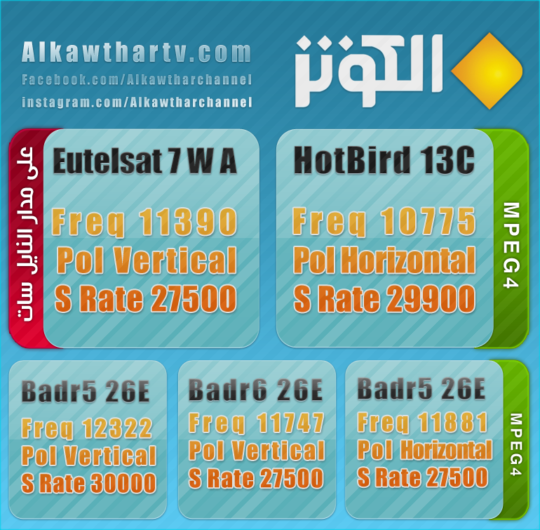 واليكم كافة الترددات لقناة الكوثر الفضائية على الأقمار الصناعية المختلفة...