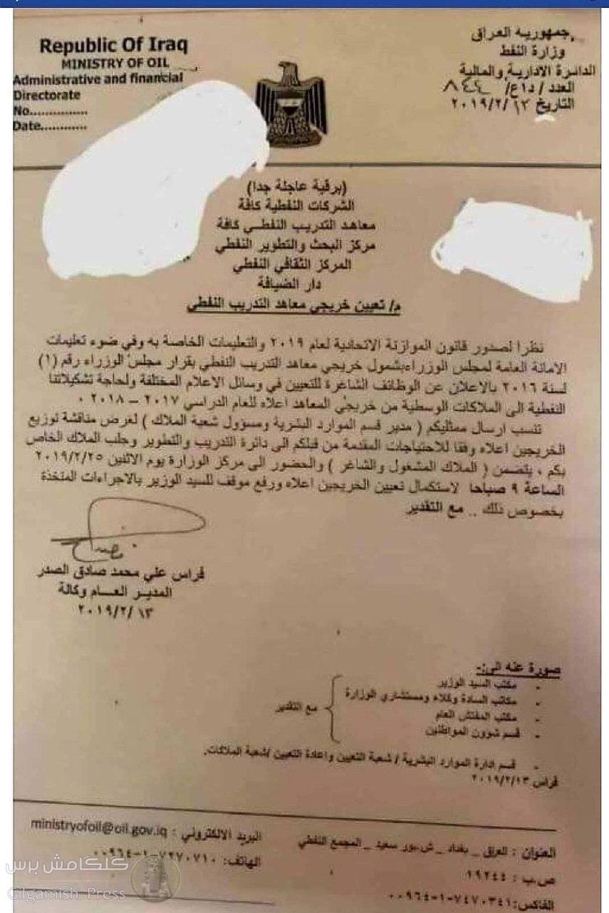 وذكرت وثيقة صادرة عن وزارة النفط؛“نظراً لصدور قانون الموازنة الاتحادية لعام 2019 والتعليمات الخاصة به وفي ضوء تعليمات الأمانة العامة لمجلس الوزراء بشمول خريجي معاهد التدريب النفطي بقرار مجلس الوزراء رقم (1) لسنة 2016 بالإعلان عن الوظائف الشاغرة للتعيين في وسائل الإعلام المختلفة ولحاجة تشكيلاتنا النفطية الى الملاكات الوسطية من خريجي المعاهد أعلاه للعام الدراسي 2017- 2018ننسب ارسال ممثليكم لغرض مناقشة توزيع الخريجين أعلاه وفقا للاحتياجات المقدمة من قبلكم الى دائرة التدريب والتطوير وجلب الملاك الخاص بكم؛ ويتضمن (الملاك المشغول والشاغر) والحضور الى مركز الوزارة لاستكمال تعيين الخريجين أعلاه ورفع موقف الى الوزير بالإجراءات المتخذة بخصوص ذلك.