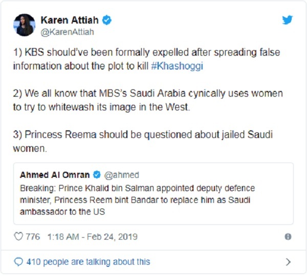 وقالت عطية: "كان يجب طرد خالد بن سلمان بشكل رسمي، بعد نشره معلومات خاطئة أدت لمقتل خاشقجي".