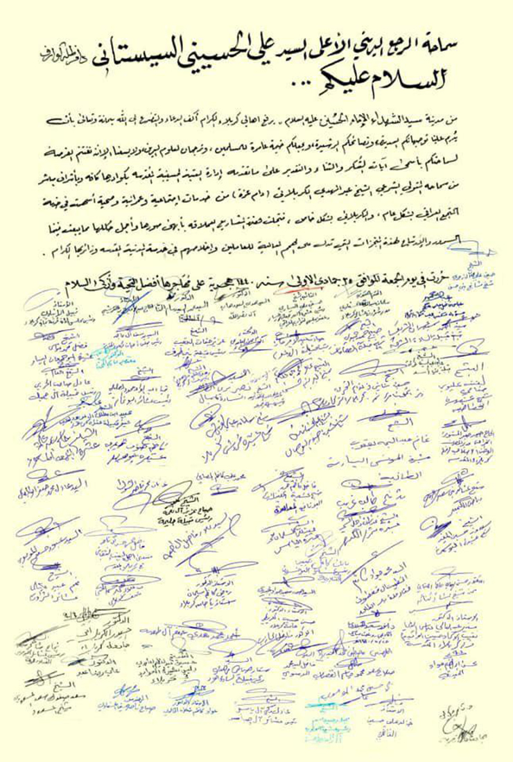 وجاء في نص الوثيقة: (سماحة المرجع الديني الأعلى السيد علي الحسيني السيستاني دام ظله الوارف} السلام عليكم: