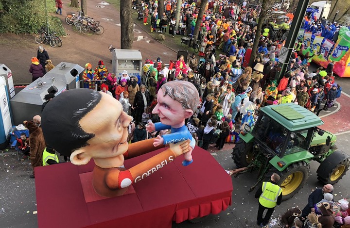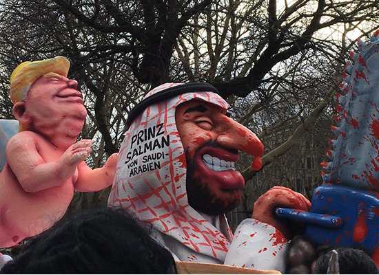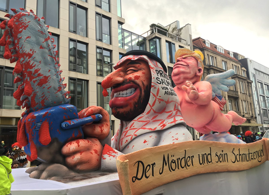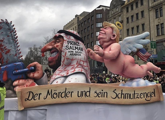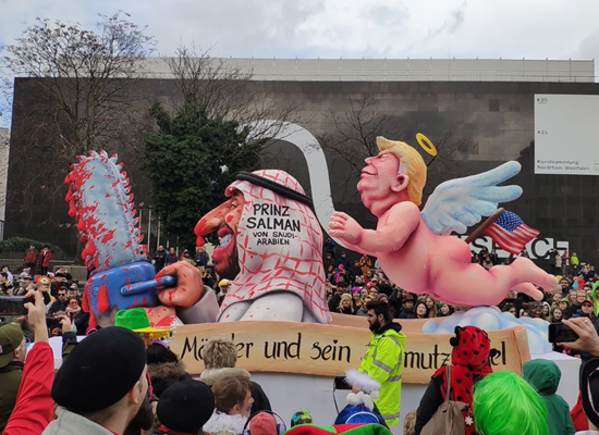 واعتادت "دوسلدورف" منذ سنوات طويلة، على تنظيم كرنفال محلي، تشارك فيه مئات الفرق والفعاليات الفنية، وتصنع لأجله مجسمات كبيرة تحمل الكثير منها رسائل سياسية بطريقة ساخرة. وحل ابن سلمان ضيفا على كرنفال هذا العام، وهو يحمل منشارا يقطر بالدماء التي غطت ملابسه أيضا، وخلفه ترامب يطير بجناحين. وكتب على مجسم ابن سلمان: "القاتل وملاكه الحارس"، في إشارة لقتل خاشقجي، ودفاع ترامب عن ولي العهد السعودي.