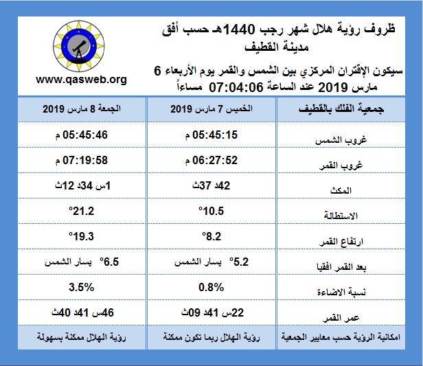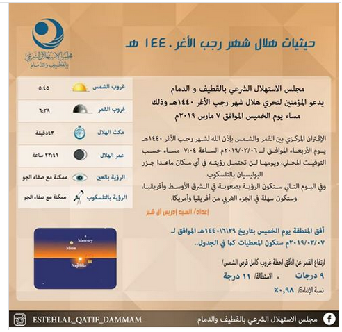 أكدت جمعية الفلك بالقطيف، بأن رؤية هلال شهر رجب 1440هـ، يوم الخميس 7 مارس 2019م، في المنطقة ممكنة ولكنها غير مؤكدة حتى مع صفاء الجو، وذلك لكون خصائص رؤية الهلال الهندسية حرجة وقد تؤثر فيها الخصائص الفيزيائية المؤثرة فلا يمكن يمكن رؤيته حتى مع صفاء الجو.