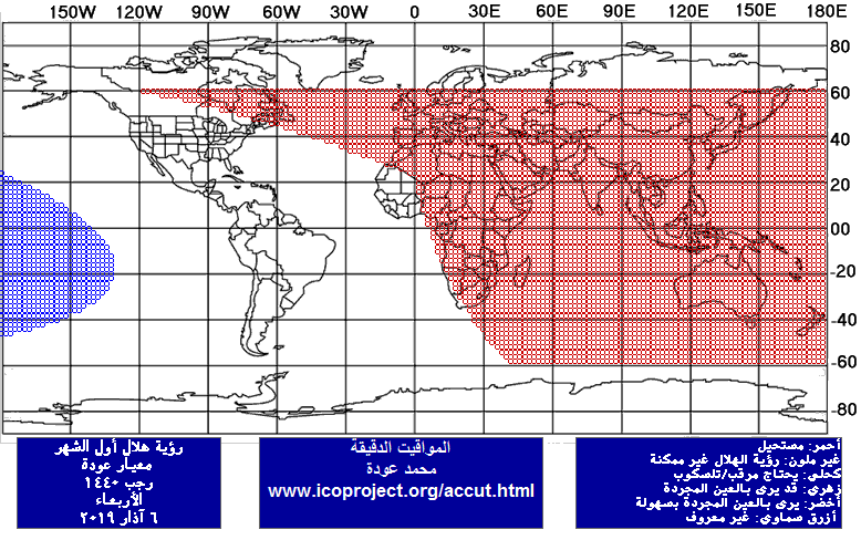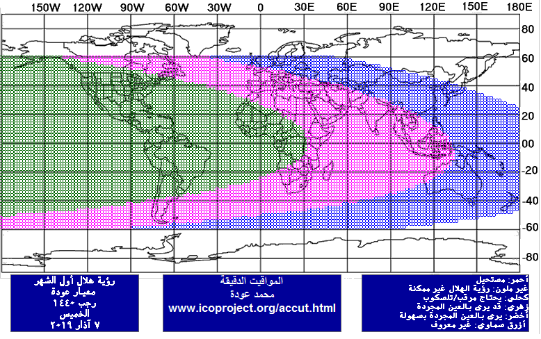 الخميس ليلاً 7/3/2019 : الرؤية بالعين المجردة ممكنة ابتداءً من إيران والخليج الفارسي ومحققة في غرب أفريقيا والأمريكيتين.