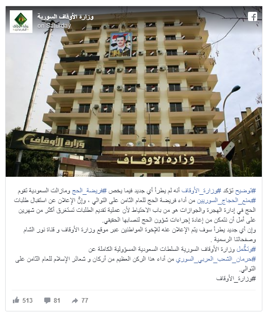 وقالت الوزارة إنها تحمّل السلطات السعودية "المسؤولية الكاملة عن حرمان الشعب العربي السوري من أداء هذا الركن العظيم من أركان وشعائر الإسلام".