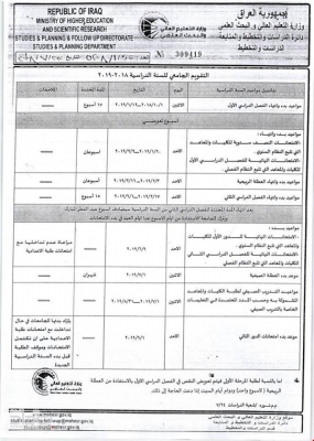 ووفق وثيقة صادرة من الوزارة فان الامتحانات تبدأ يوم 9/6/2019، فيما يبدأ الدور الثاني 1/9/2019