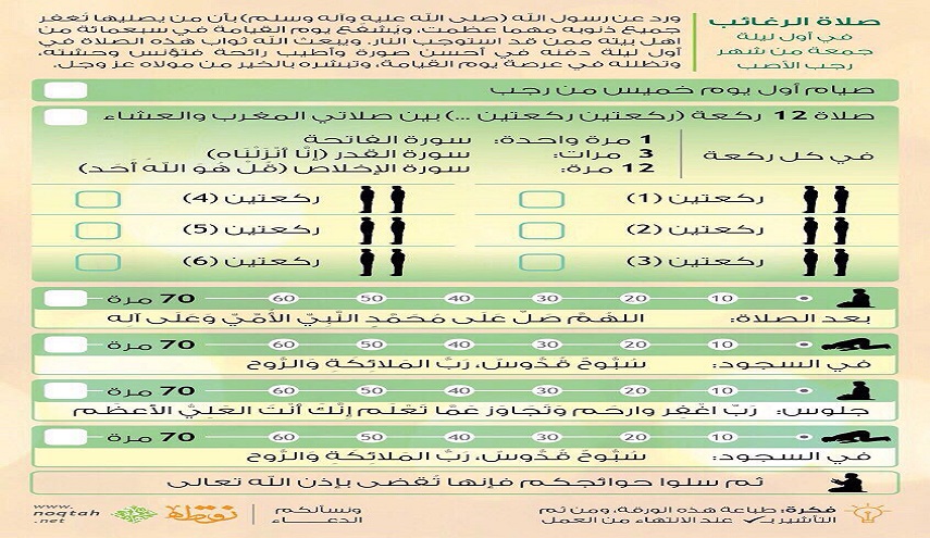صلاة اثني عشر ركعة ما بين صلاة المغرب والعشاء، ويختم كل ركعتين بتشهد وتسليم. ويقرأ في كل ركعة سورة الحمد مرة واحدة، وسورة القدر ثلاث مرات، وسورة التوحيد اثني عشر مرة.