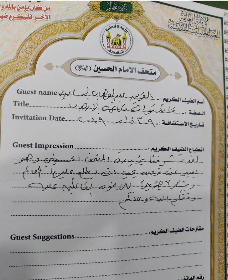 لقد تشرفنا بزيارة المتحف الحسيني وهو يعبر عن ثروة يجب ان يطلع عليها العالم وشكرا جزيلا للأخوة القائمين عليه وفقكم الله ورعاكم.