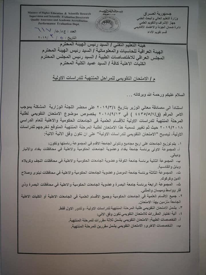 العراق_الكوثر:تنشر الفرات الكتاب الرسمي والتعليمات الامتحانية الجديدة بخصوص تطبيق الامتحان الوزاري للمراحل المنتهية للاختصاصات العلمية في جميع الجامعات الحكومية والاهلية وابتداء من هذا العام :