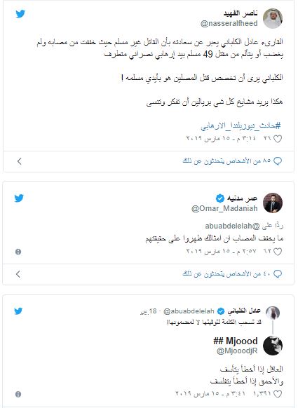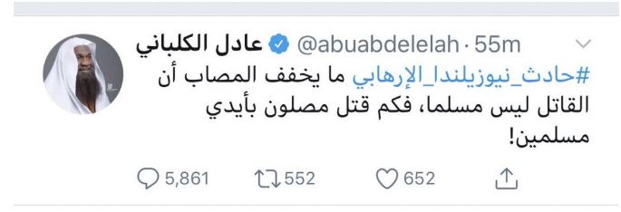 وغرّد “الكلباني” عبر حسابه في “تويتر” قائلاً: ” حادث نيوزيلندا الإرهابي ما يخفف المصاب أن القاتل ليس مسلماً، فكم قتل مصلون بأيدي مسلمين”.