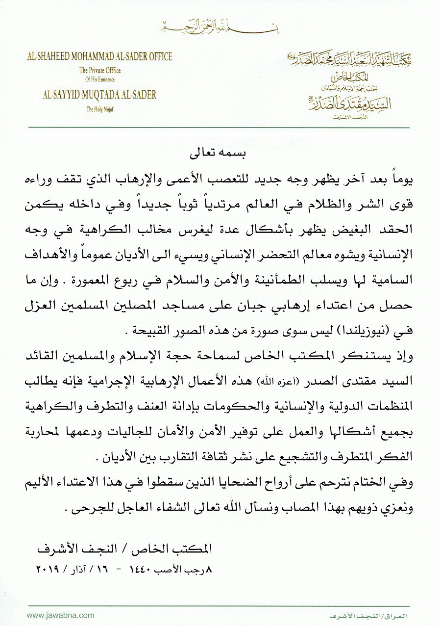 وذكر المكتب في بيان اليوم، (16 آذار 2019)، أنه "يوما بعد يوم يظهر وجه جديد للتعصب الاعمى والارهاب الذي تقف وراءه قوى الشر والظلام في العالم مرتديا ثوبا جديدا وفي داخله يكمن الحقد البغيض يظهر باشكال عدة ليغرس مخالب الكراهية في وجه الانسانية ويسيء إلى الاديان عموما والاهداف السامية لها ويسلب الطمأنينة والسلام في ربوع المعمورة".