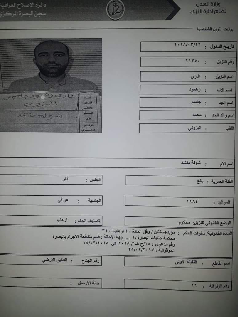 يذكر ان المتهم مطلوب بالمادة 4 ارهاب وضمن المادة 310 اي محكوماً بالمؤبد اضافة الى عامين.