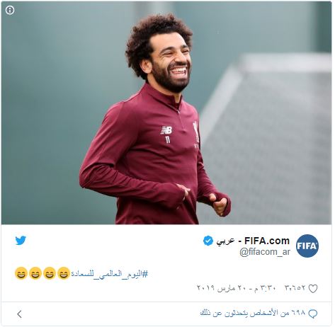 ونشرت الصفحة الرسمية للفيفا صورة النجم المصري محمد صلاح جناح نادي ليفربول الإنجليزي وعلقت عليها بوسم (هاشتاج) اليوم العالمي للسعادة.