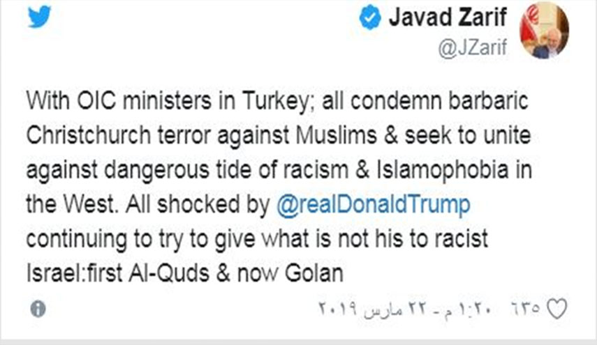 وكتب ظريف، الذي وصل إلى تركيا للمشاركة في اجتماع طارئ لوزراء خارجية دول منظمة التعاون الإسلامي، اليوم الجمعة، كتب في حسابه على "تويتر" أن "الجميع مصدومون بمواصلة ترامب تسليم ما ليس ملكا له إلى إسرائيل العنصرية: أولا القدس والآن الجولان".